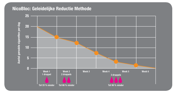 Met onderstaande weergave is te zien hoe de Graduele Reductiemethode precies werkt. In week 1 wordt 1 druppel aangebracht op de filter waardoor 33 % van de opname van nicotine en teer wordt geblokkeerd. In week 2 wordt door 2 druppels 66 % geblokkeerd en vanaf week 3 zorgen 3 druppels voor een bijna volledige blokkering (99 %). In deze periode moet het sigaretten gebruik terug gebracht worden tot op een niveau waarop zelfstandig makkelijk en succesvol gestopt kan worden.